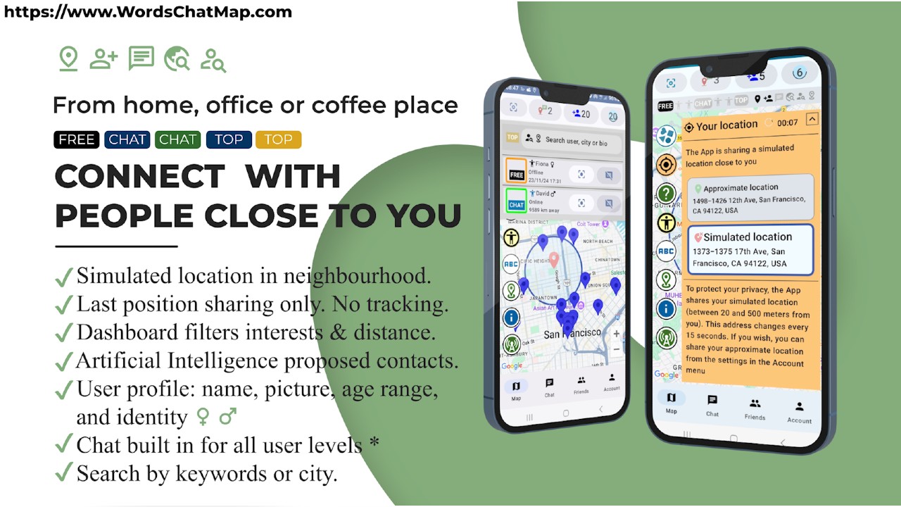 Find people close to you, either by hobbies or geographical location, send a connection request, chat and meet in person. With Wordschatmap you have new friends at your fingertips.
